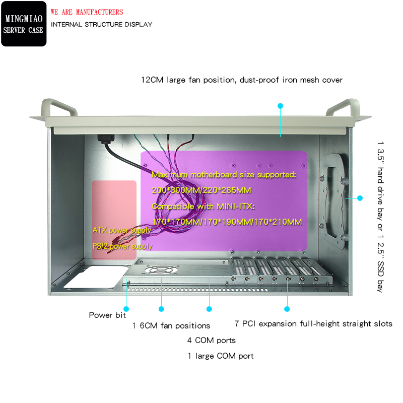 Supports 170*215 motherboards and has a compact size of 250mm x 170mm x 215mm (length x width x height). This makes it ideal for a compact rack mount box.